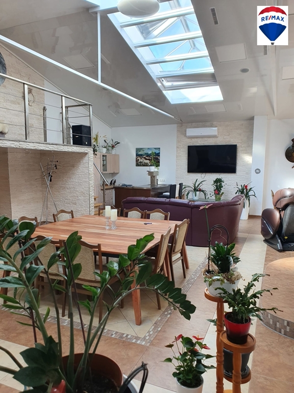 Angrenzend zur Wohnung liegt ein lichtdurchfluteter Partyraum mit erstklassiger Ausstattung und vielen raffinierten Ausstattungsdetails, wie einer Bar-Küche, einer Fußbodenheizung, Klimaanlage sowie einer kleinen Bühne und vielem mehr. Ein großer Esstisch mit Stühlen bietet hier ausreichend Platz, sodass man mit Familie und Freunden in fröhlicher Runde essen und feiern kann.