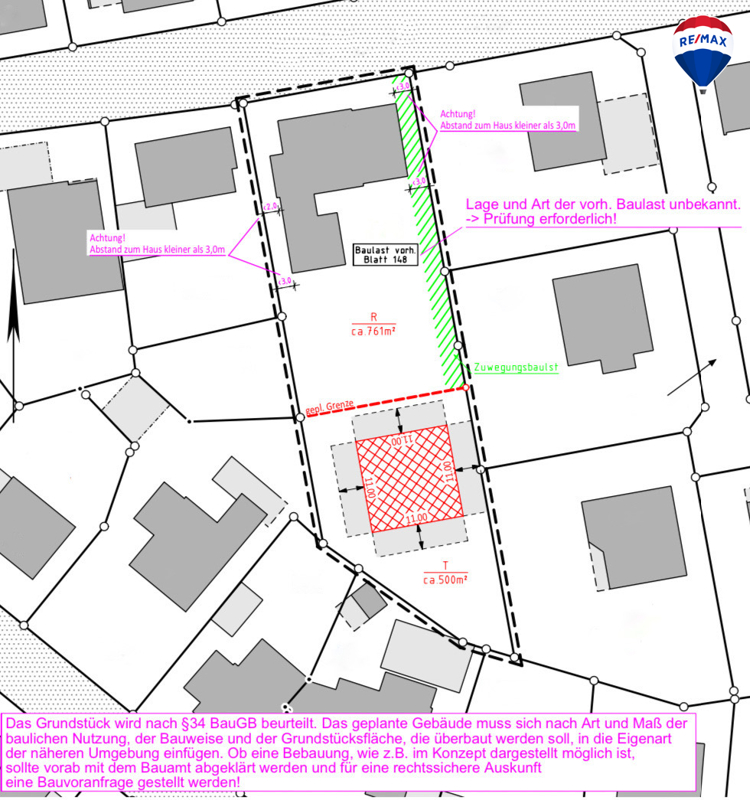 Eventuell kann im hinteren Bereich des Grundstücks nach §34 gebaut werden, dies muss noch beim Bauamt angefragt werden; siehe Teilungsvorschlag des Vermessers) !