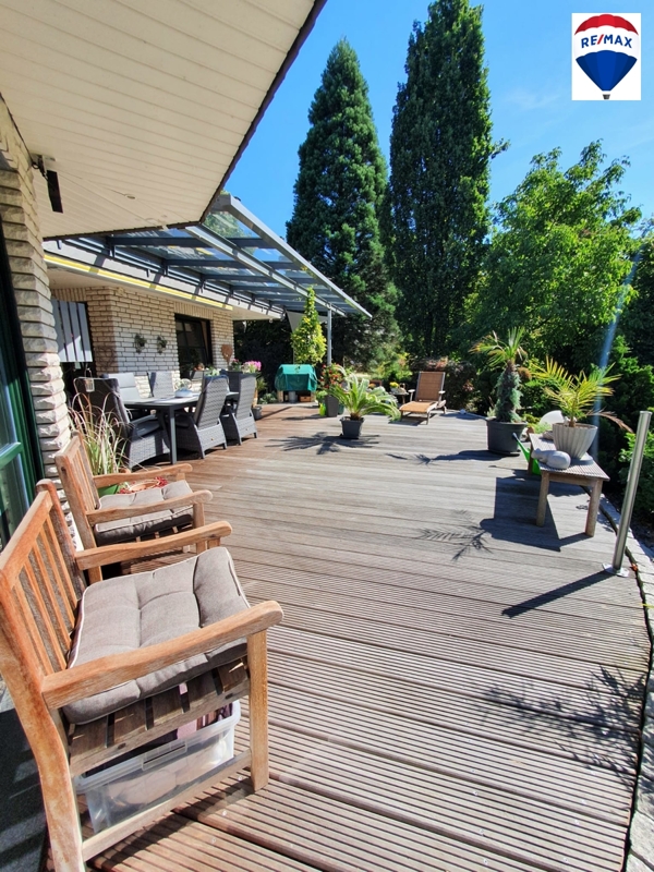 Die große Terrasse ist teilweise überdacht und bietet ausreichend Platz für gemütliche Sitzmöglichkeiten und Gartenmöbel.