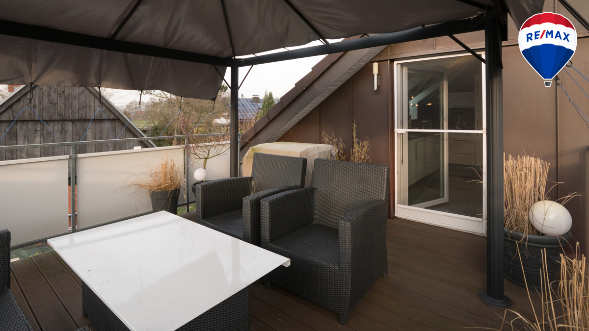 Über die Küche gelangen Sie auf die ca. 16 m² große Dachterrasse, welche ausreichend Platz für schöne Loungemöbel bietet und mit einer tollen Aussicht auf den großen Garten zum Verweilen einlädt.