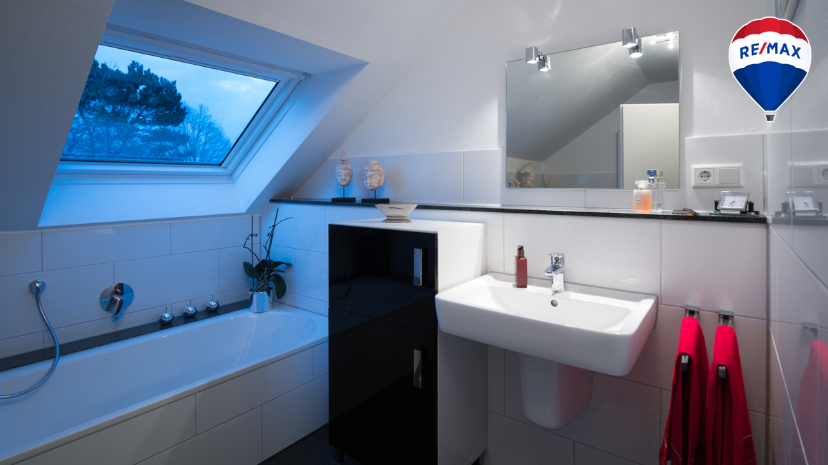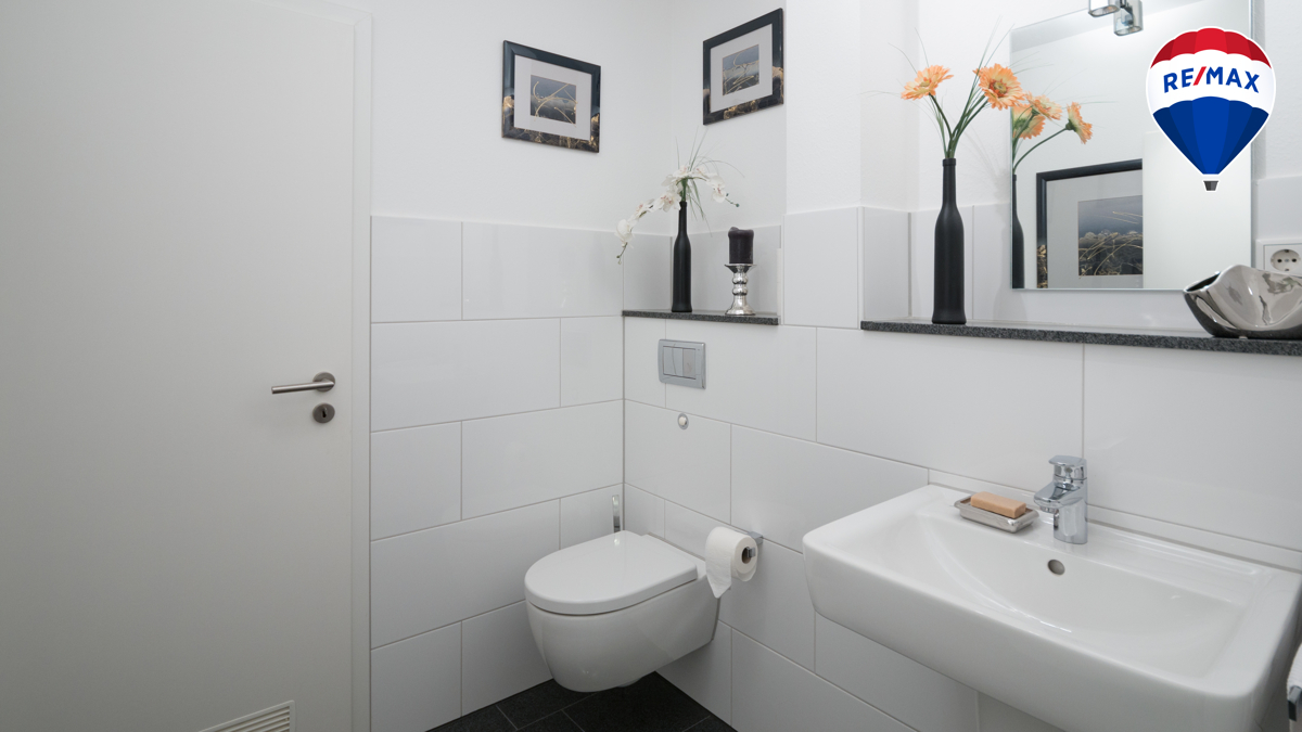Zudem verfügt die Wohnung über ein modernes Badezimmer mit einer Handtuchheizung, einer Badewanne und einer ebenerdigen Dusche sowie einen Hauswirtschaftsraum, ein Gäste-WC und einen Abstellraum.