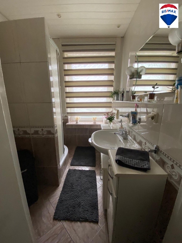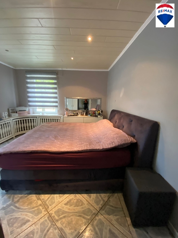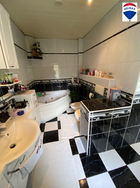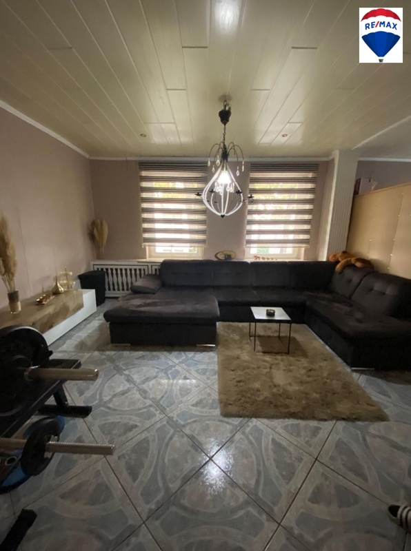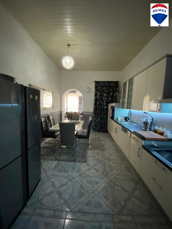 Im Erdgeschoss des Hauses befindet sich eine ca. 150 m² große Wohnung mit einem Kinderzimmer mit Abstellraum, einem Büro, einem Wohn- und Schlafraum, einem Schlafzimmer mit Badezimmer und Badewanne, einem großen Wohnzimmer, einer gemütlichen Küche mit Essbereich und einem Gäste-WC mit Dusche.