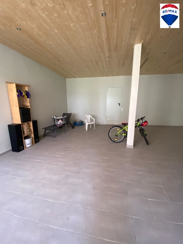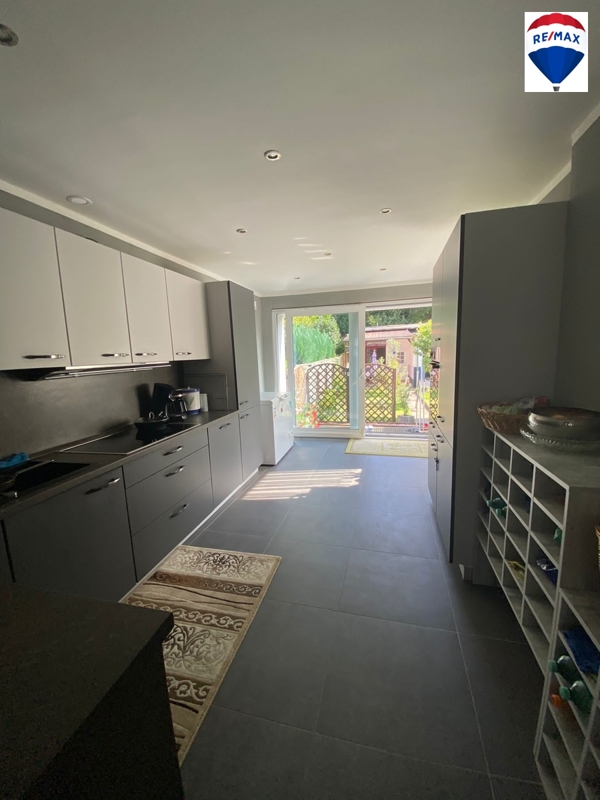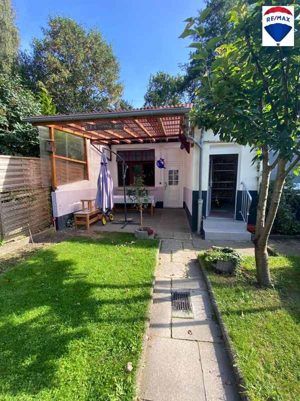 Über die Küche gelangen Sie in den grünen Garten, welcher mit einem Gartenhaus, einer ca. 50 m² großen Halle und einer überdachten Terrasse ausgestattet ist.