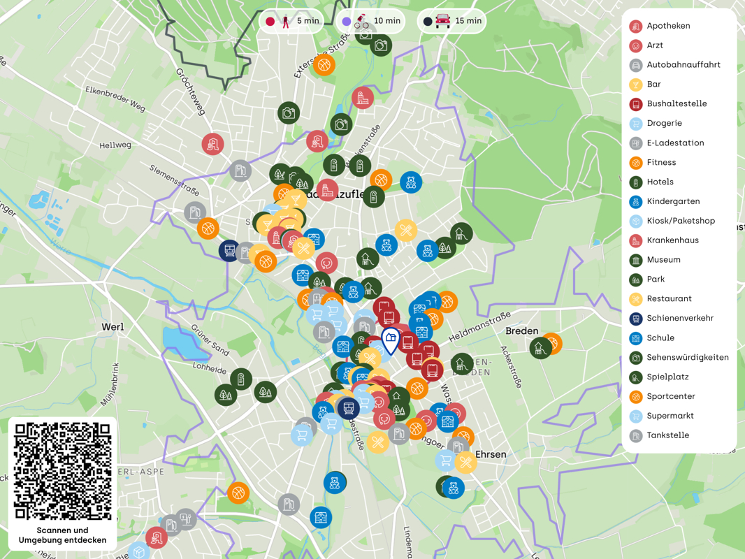 Für Freizeitaktivitäten gibt es in der Nähe Parks und zahlreiche Möglichkeiten, die Natur zu genießen, während die Innenstadt von Bad Salzuflen mit ihren historischen Gebäuden und einem vielfältigen Kulturangebot ebenfalls schnell erreichbar ist. Alles in allem bietet die Lage der Wohnung eine gelungene Kombination aus Ruhe, Lebensqualität und urbanem Flair.