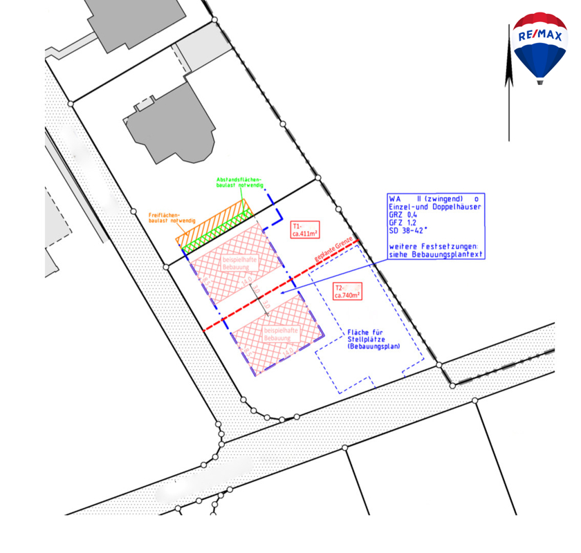 Das Grundstück ist nach Bebauungsplan bebaubar und eignet sich für ein zwei-geschossiges Einfamilien- oder Doppelhaus mit Satteldach.