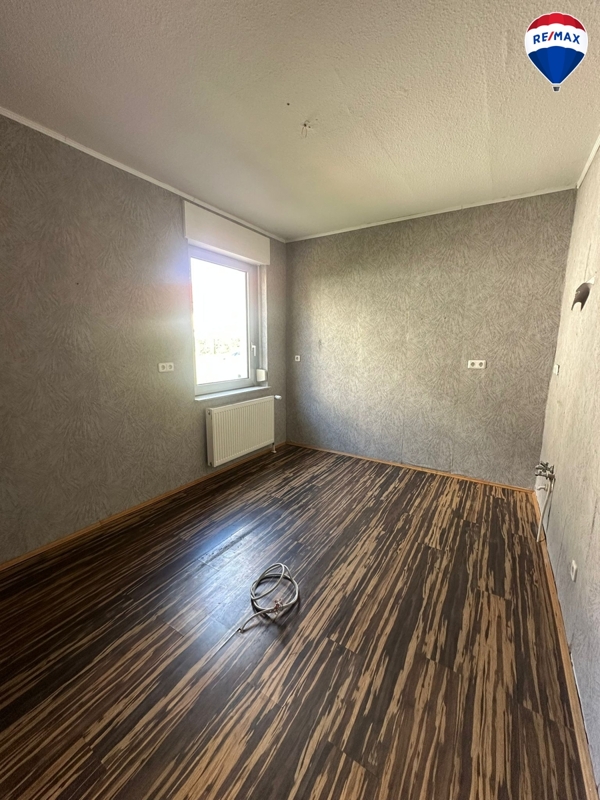 Im Obergeschoss wiederholt sich die Grundaufteilung nahezu identisch. Hier wurde ein Teil der Wohnung bereits modernisiert, insbesondere das Badezimmer, das mit einer Badewanne, hochwertigen Fliesen und LED-Deckenspots ausgestattet ist.