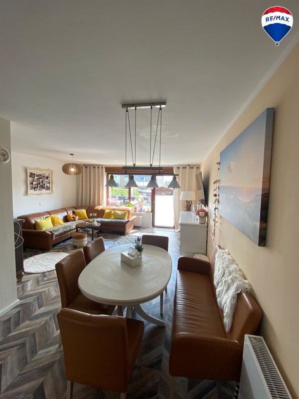Erdgeschoss: Großes, lichtdurchflutetes Wohnzimmer mit Essecke, Offene Küche, Gäste-WC mit Dusche, Zugang zur Terrasse Markise auf der Terrasse