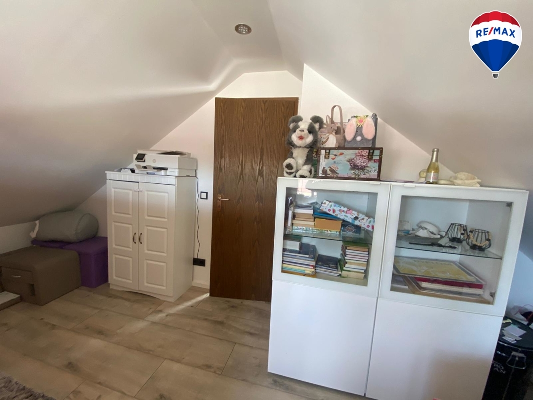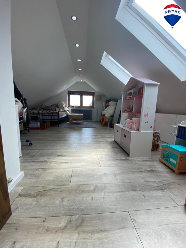 Das Obergeschoss bietet zwei gut geschnittene Schlafzimmer sowie ein helles Badezimmer, das mit Badewanne, Waschbecken und WC ausgestattet ist. Das ausgebaute Dachgeschoss beherbergt zwei weitere Räume, die sich ideal als Kinder-, Gäste- oder Arbeitszimmer eignen.
