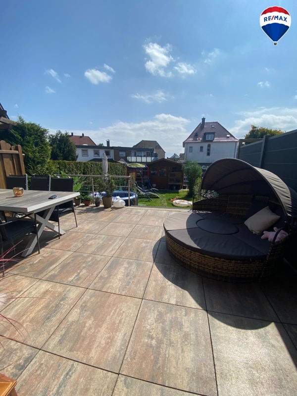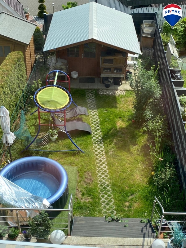Das ca. 182 m² große Grundstück ist pflegeleicht angelegt und bietet dennoch viel Platz zum Entspannen, Spielen und Genießen.