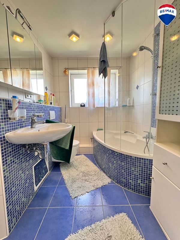 Das modernisierte Badezimmer (2008) ist mit einer Badewanne ausgestattet und rundet das stimmige Gesamtbild ab. Im Zuge der damaligen Sanierungsmaßnahmen wurden ebenfalls die Böden sowie die Elektrik erneuert. Deckenspots sorgen für stilvolle Beleuchtung in den Wohnräumen.