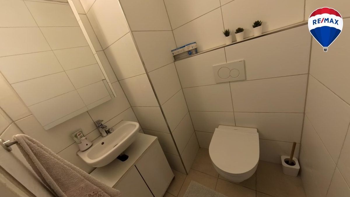Das Badezimmer wurde modernisiert und verfügt über eine ebenerdige Dusche, ein wandhängendes WC und ein ansprechendes, zeitgemäßes Fliesendesign. Zusätzlich steht ein separates Gäste-WC zur Verfügung.
