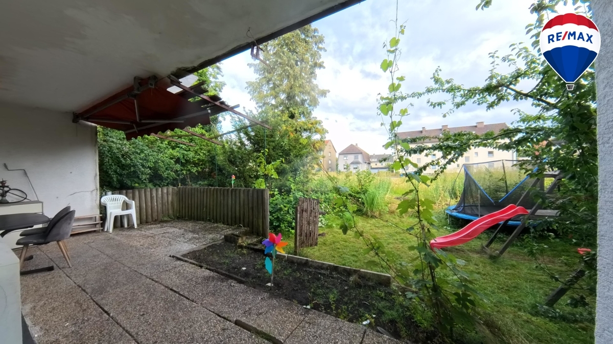 Das Herzstück der Wohnung bildet das große Wohn- und Esszimmer, das mit seiner Weitläufigkeit beeindruckt. Hier finden sowohl eine großzügige Sofalandschaft als auch ein Esstisch für Familie und Gäste bequem Platz. Besonders hervorzuheben ist der direkte Zugang zur überdachten Terrasse, die in den ruhigen, begrünten Garten führt – perfekt für entspannte Abende im Freien oder das Frühstück im Grünen.