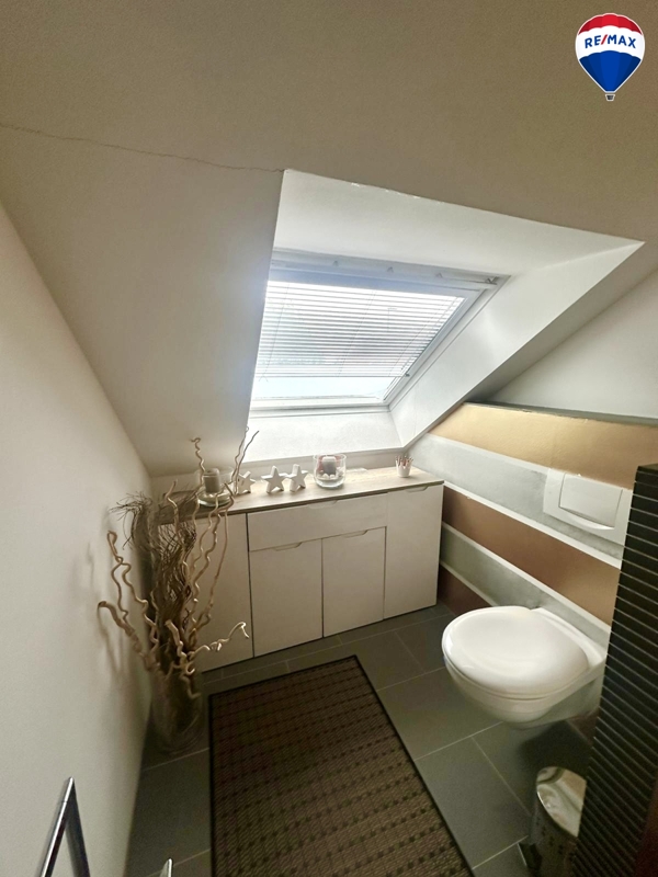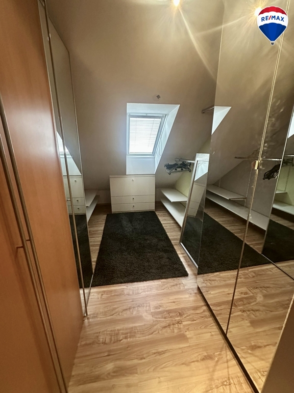 Das Dachgeschoss bietet weiteren Platz für die ganze Familie: Auf der rechten Seite liegt ein großzügiges Schlafzimmer, das derzeit als Kinderzimmer genutzt wird, ergänzt durch ein Badezimmer und einen Balkon. Auf der linken Seite befinden sich ein Schlafzimmer mit Ankleideraum, ein weiteres Bad mit Dusche sowie eine Loggia, die zusätzlichen Wohnkomfort schafft.