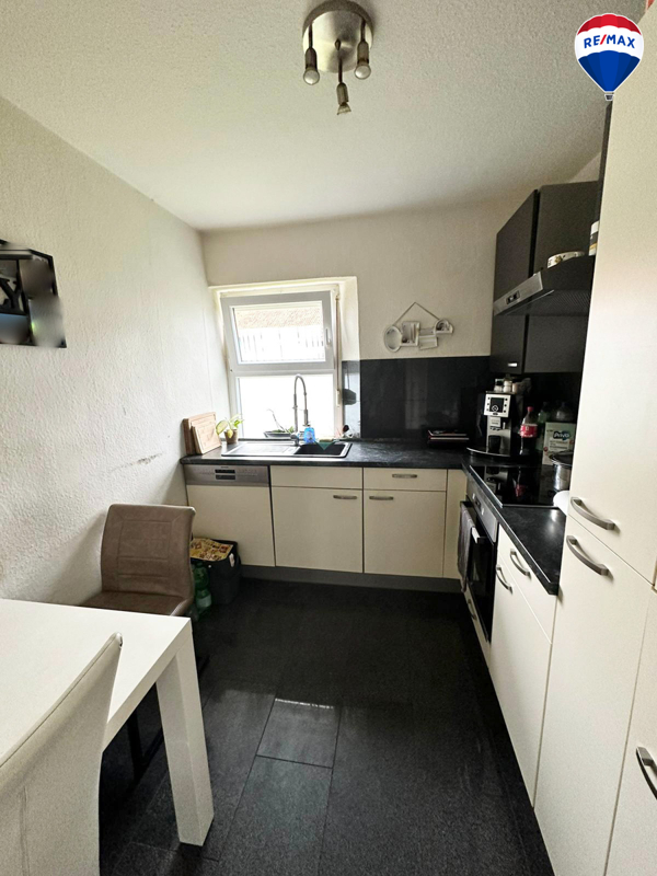 Sie liegt im ersten Obergeschoss und bietet auf ca. 60 m² drei geräumige Zimmer, eine gemütliche Küche mit Essbereich und ein Badezimmer mit Badewanne.