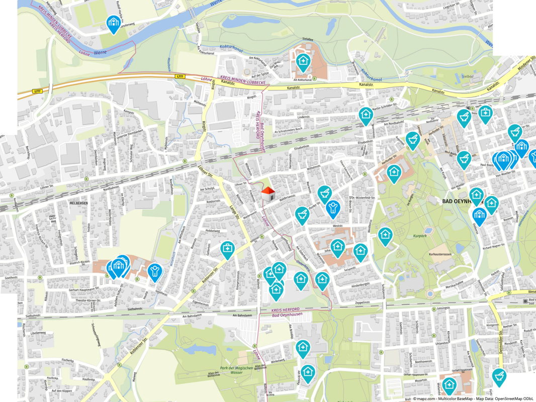 Diese außergewöhnliche Immobilie befindet sich in einer der begehrtesten Wohnlagen von Bad Oeynhausen – ruhig, grün und dennoch mitten im Zentrum. Die leichte Hanglage mit direktem Bachlauf schafft eine naturnahe Wohnatmosphäre, wie sie in dieser zentralen Lage nur äußerst selten zu finden ist.Alle Einrichtungen des täglichen Bedarfs, darunter Einkaufsmöglichkeiten, Ärzte, Apotheken, Restaurants, Cafés und der weitläufige Kurpark, sind fußläufig in wenigen Minuten erreichbar. Auch Schulen, Kindergärten sowie der Bahnhof befinden sich in direkter Umgebung. Die hervorragende Anbindung an den öffentlichen Nahverkehr und die Nähe zur A2 und A30 ermöglichen zudem eine schnelle Erreichbarkeit der umliegenden Städte.