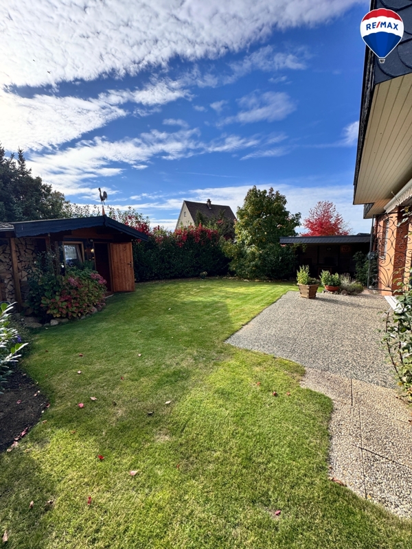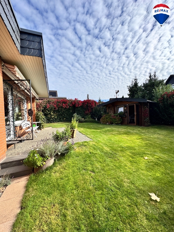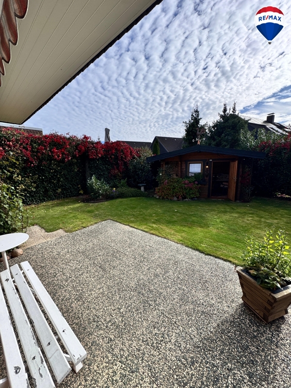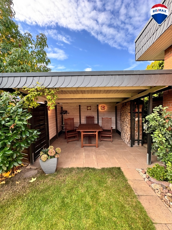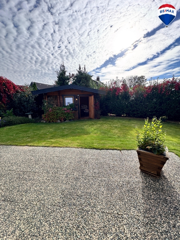 Im Außenbereich erwarten Sie eine ca. 15 m² große Terrasse mit elektrischer Markise, ein liebevoll angelegter Garten mit Gartenhaus und überdachtem Sitzbereich sowie ausreichend Abstellmöglichkeiten: Eine Beton-Fertiggarage mit elektrischem Tor und zusätzlichem Abstellraum, ein Carport und weitere Stellplätze stehen zur Verfügung.