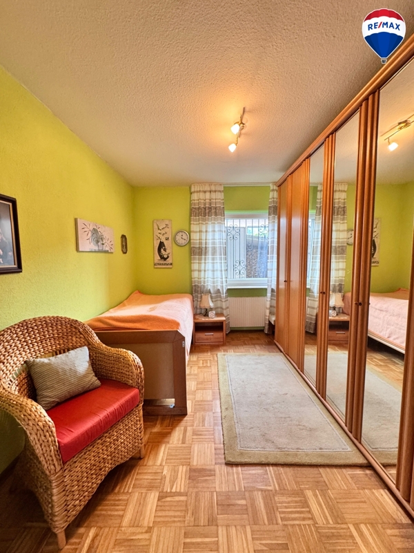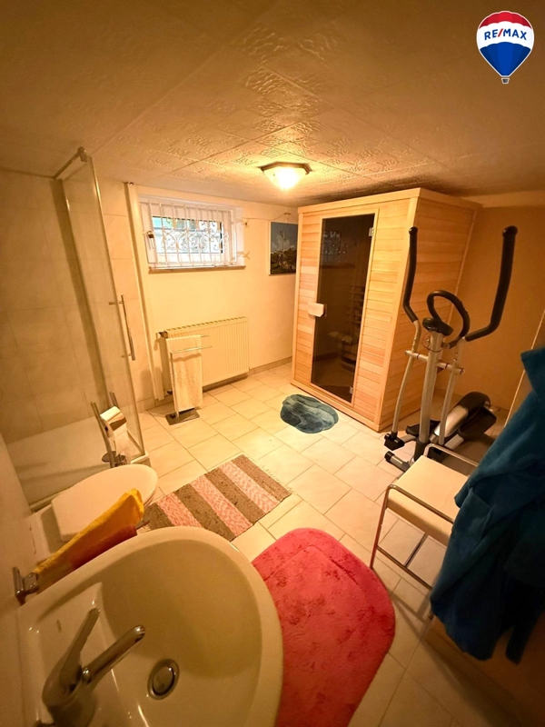 Der Keller bietet vielfältige Nutzungsmöglichkeiten: Neben einem beheizten Hobby- bzw. Gästezimmer stehen Ihnen drei weitere Kellerräume zur Verfügung. Zudem befindet sich hier ein kleiner Spa-Bereich mit Infrarot-Wärmekabine, Dusche, WC und Waschbecken. Eine Wasserenthärtungsanlage ist ebenfalls vorhanden.