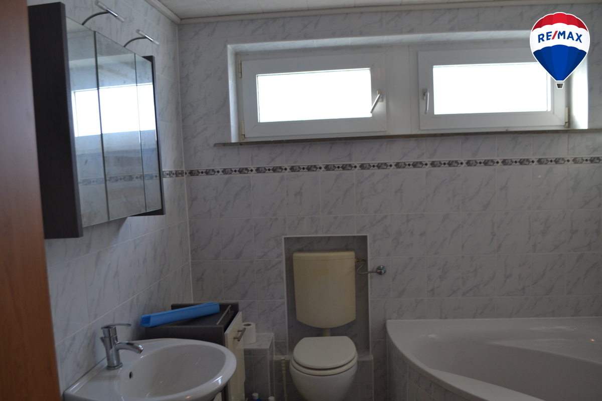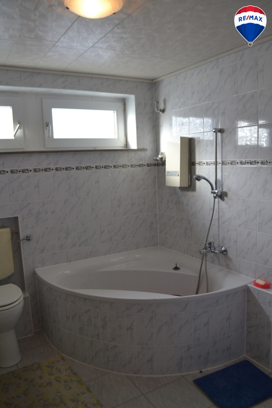 Das Badezimmer ist mit einer eleganten Eckbadewanne ausgestattet, die für einen Hauch von Luxus sorgt. Es wurde mit Fliesenboden versehen, der leicht zu reinigen und zugleich optisch ansprechend ist.