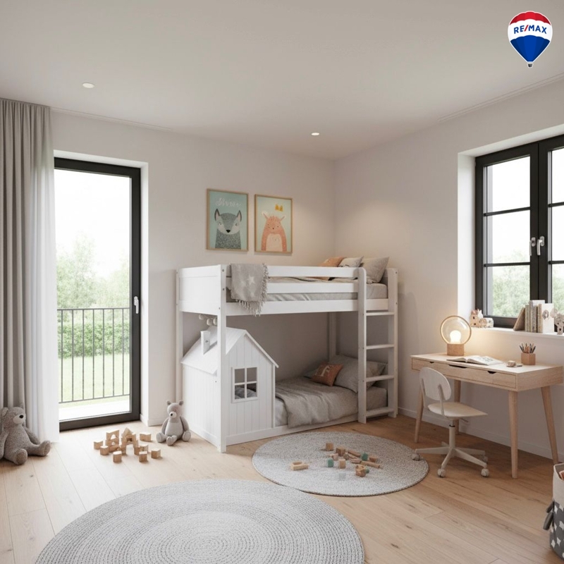 Im ersten Obergeschoss erwarten Sie ein gemütliches Schlafzimmer, zwei helle Kinderzimmer und ein modern ausgestattetes Badezimmer, das zum Entspannen einlädt.