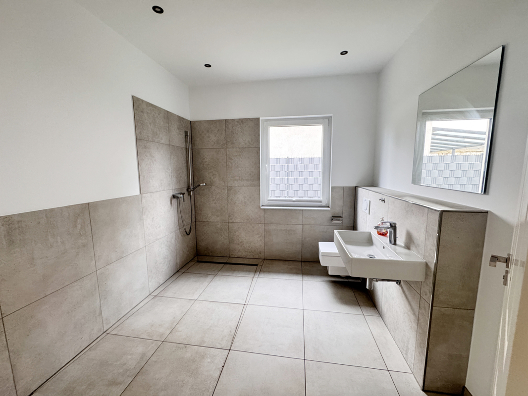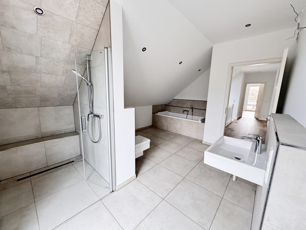 Das große Badezimmer ist modern gestaltet und bietet neben einer ebenerdigen Dusche auch eine Badewanne, die zum Entspannen einlädt. Die hochwertige Ausstattung sorgt für ein luxuriöses Ambiente.