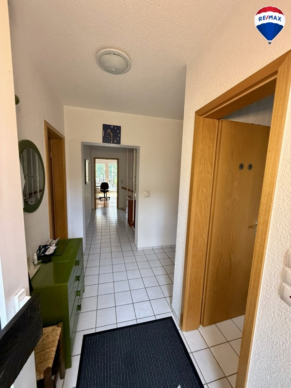 Über den Eingangsbereich gelangen Sie in den Flur. Auf der rechten Seite befindet sich ein praktisches Gäste-WC mit Fenster. Die angrenzende Diele bietet ausreichend Platz für eine Garderobe. Die großzügige Küche mit Einbauküche und Essbereich auf der linken Seite lädt zum gemeinsamen Kochen und Verweilen ein. Das helle Wohnzimmer mit Zugang zur Terrasse und zum eigenen, umzäunten Garten bildet das Herzstück des Hauses. Der Flurboden ist gefliest, im Wohnzimmer liegt Parkett. Ein Schornstein für einen Kamin ist bereits vorbereitet.