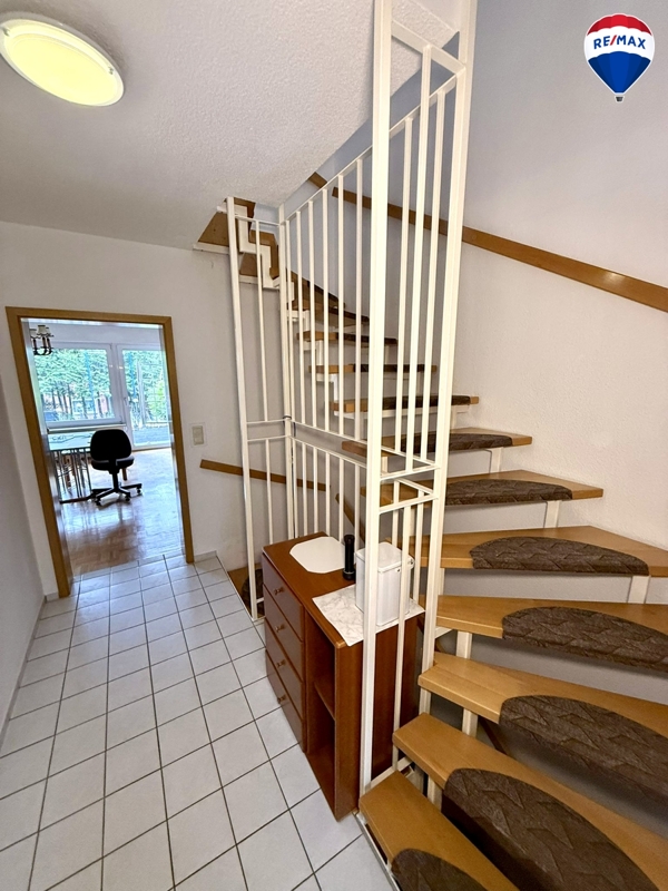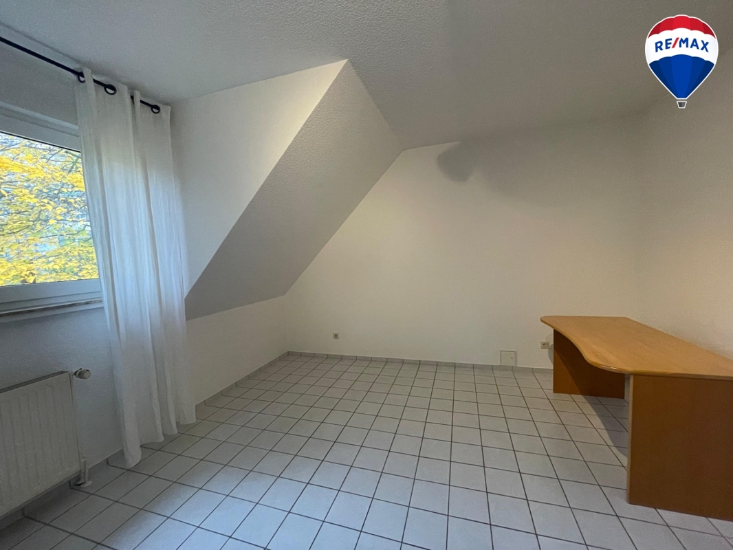 Über die Treppe gelangen Sie in das Obergeschoss, das 2 Schlafzimmer – eines mit Zugang zum Balkon – sowie ein Badezimmer mit Badewanne und Dusche umfasst. Die Dachflächenfenster sind aus Holz, die Rollläden im DG sorgen für angenehme Verdunkelung.