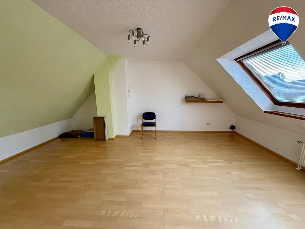Das Dachgeschoss bietet ein weiteres, großzügiges Zimmer, das flexibel als Wohn- und Schlafbereich genutzt werden kann.