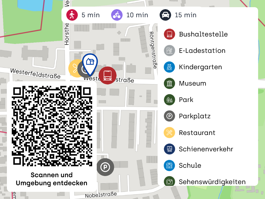 Darüber hinaus bietet die Lage eine hohe Wohnqualität durch zahlreiche Grünflächen und Spazierwege in der Nähe. Der nahegelegene Gellershagener Park lädt zu entspannten Spaziergängen und sportlichen Aktivitäten im Freien ein. Die ruhige Wohnstraße, in der sich das Haus befindet, ist überwiegend von Anwohnern befahren und vermittelt ein angenehmes, familiäres Wohngefühl.