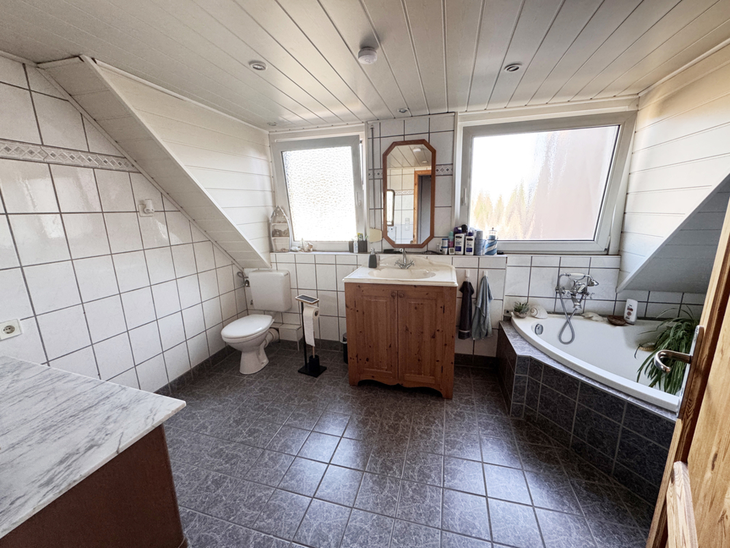 Die zweite Wohneinheit im Obergeschoss und Dachgeschoss wurde laufend modernisiert und umfasst ca. 130 m² Wohnfläche. Der offene Wohn-, Ess- und Küchenbereich, ein Gäste-WC mit Anschlüssen für eine Dusche, ein Allzweckraum, ein Schlafzimmer und ein Wintergarten mit Balkonzugang bieten durchdachten Wohnkomfort. Zusätzlich befinden sich im Obergeschoss zwei Durchgangszimmer, die flexibel nutzbar sind – beispielsweise als Büro, Spielzimmer oder Ankleide. Im ausgebauten Dachgeschoss befindet sich ein helles Bad mit Dusche und Wanne sowie ein großes Wohn-/Schlafzimmer. Ein zusätzlicher Spitzboden bietet ca. 15 m² Nutzfläche.