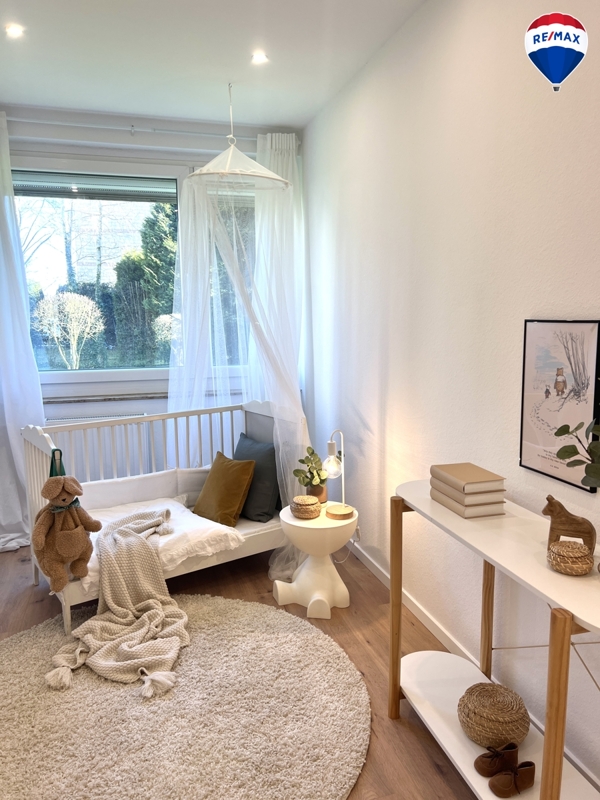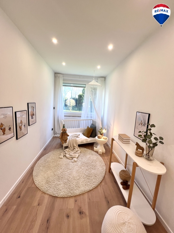 Das erste Schlafzimmer, das sich beispielsweise ideal als Kinderzimmer oder Homeoffice nutzen lässt, punktet mit einem großen Fenster und idyllischem Blick ins Grüne. Das modernisierte Badezimmer ist mit einer komfortablen Dusche ausgestattet.