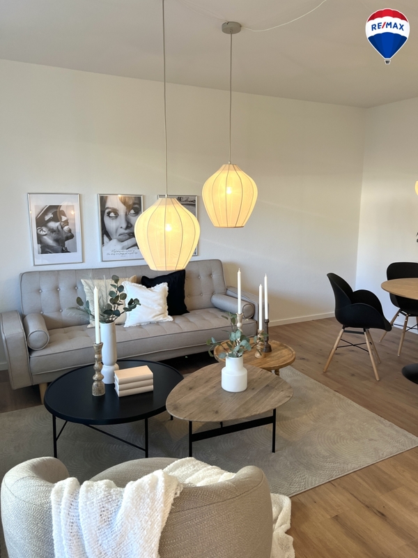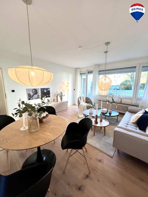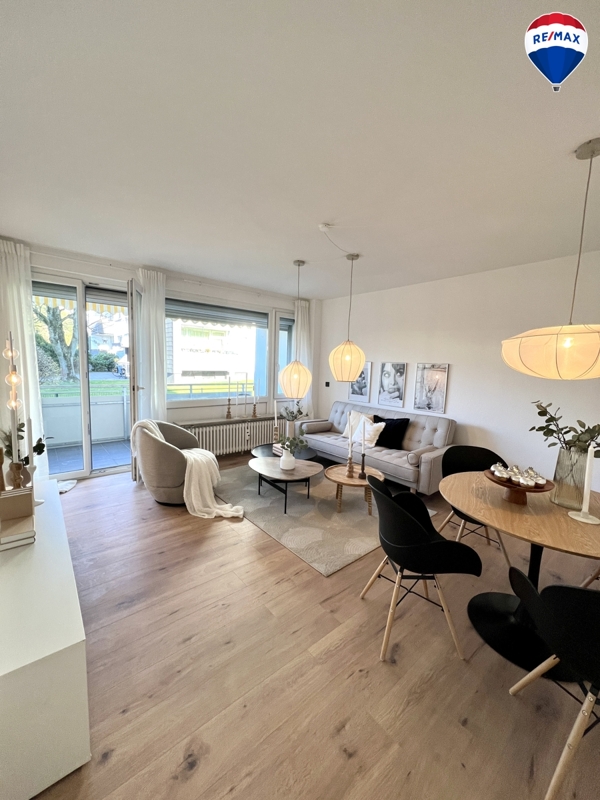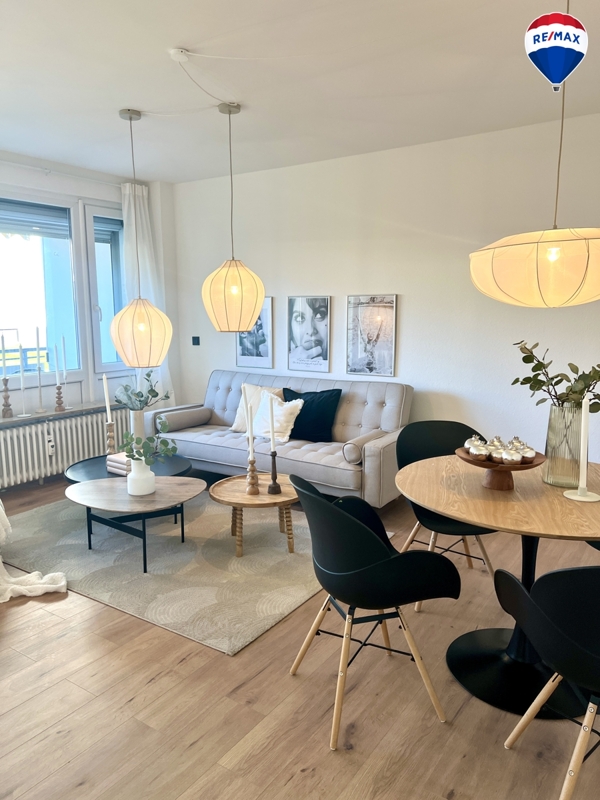 Der großzügige Wohn- und Essbereich beeindruckt durch seine Helligkeit und eine weitläufige Panoramafront, die direkt auf den Balkon führt – perfekt für entspannte Stunden im Freien.