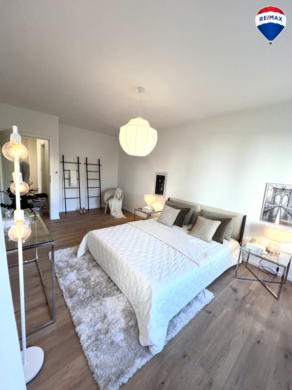 Auch das zweite Schlafzimmer verfügt über eine große Fensterfront und einen direkten Zugang zum Balkon.
